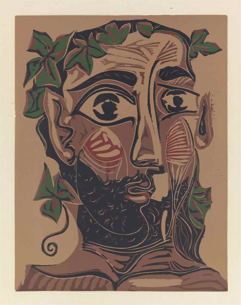 Pablo Picasso , Homme barbu couronné de feuillage de vigne ...
